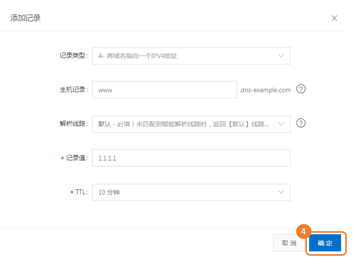 主機記錄:一般是指子域名的前綴(如需創(chuàng)建子域名為www.dns-example.com, 主機記錄輸入 www;如需實現dns-example.com,主機記錄輸入 @)。