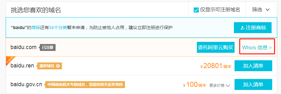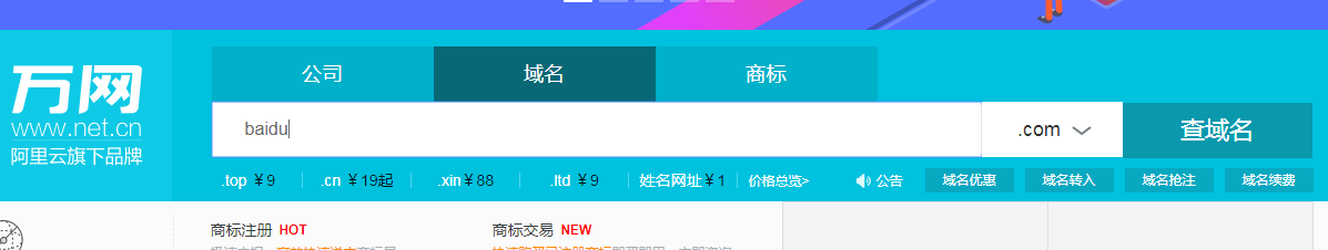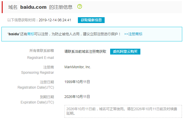 域名的注冊(cè)日期,到期日期都是公開(kāi)信息。在各大域名注冊(cè)商網(wǎng)站均能查到。這里以阿里云主頁(yè),baidu.com為例舉例: