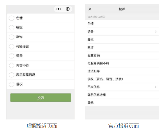 小程序官方投訴入口是平臺用以收集用戶對小程序違規(guī)內(nèi)容反饋的一個途徑。部分開發(fā)者在小程序上線后,通過采用虛假、仿冒官方投訴入口或在截屏?xí)r閃退等方式攔截用戶投訴來躲避平臺的線上監(jiān)管,或在申訴解封時通過技術(shù)手段隱藏違規(guī)內(nèi)容,在申訴審核通過后繼續(xù)違規(guī)。如下是仿冒官方投訴頁面躲避監(jiān)管的例子: