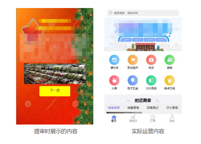小程序提交審核的版本應(yīng)與小程序?qū)嶋H發(fā)布、上線運(yùn)營的版本一致。部分開發(fā)者在代碼提審環(huán)節(jié),通過技術(shù)手段將不符合當(dāng)前類目規(guī)則或違規(guī)的內(nèi)容進(jìn)行隱藏,使得審核側(cè)看到的內(nèi)容與小程序?qū)嶋H發(fā)布后的運(yùn)營內(nèi)容無關(guān),以期通過代碼審核。如下是代碼審核內(nèi)容繞過的一個例子,該小程序不具備外賣平臺資質(zhì),在版本提審時展示了無關(guān)內(nèi)容,但實(shí)際運(yùn)營過程中提供了外賣平臺服務(wù):